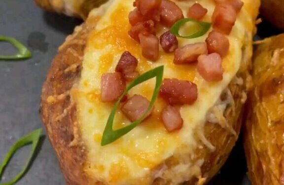 Sirva imediatamente, aproveitando o contraste entre a parte interna macia e a cobertura crocante da batata recheada de forno.